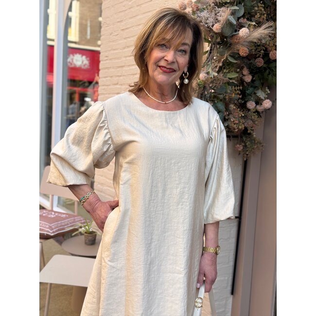 Los zittend jurk met gepofte mouwen en zakken. kleed mooi af in een soort Taft-z...