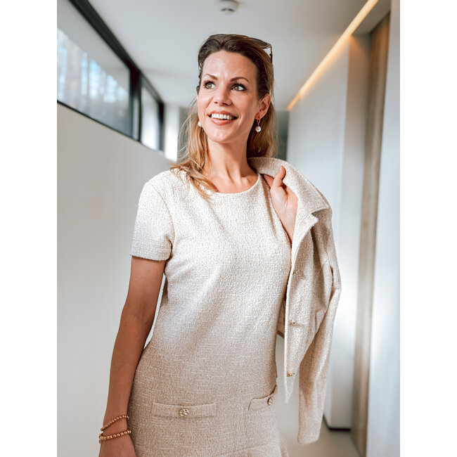 snoepje van een jurk in zomerse Chanel tweed stof met rijke textuur, gouden knopen. Ingrid draagt maat large. Lees meer.
