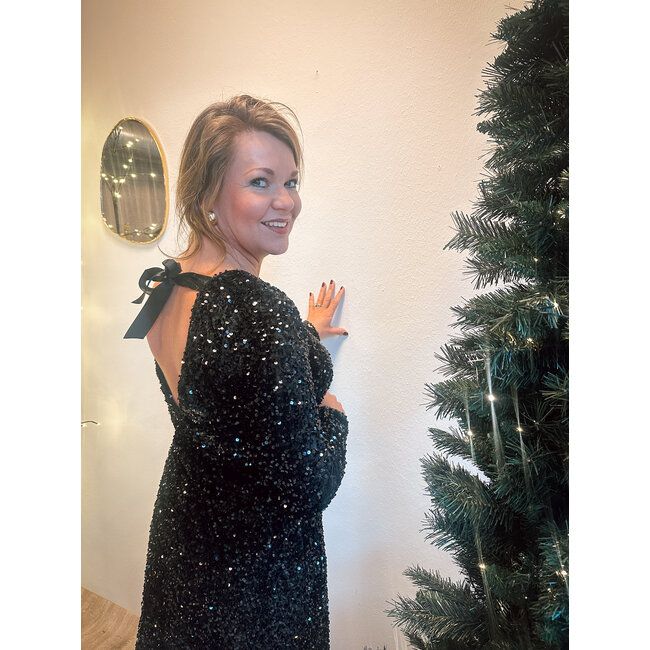 LAATSTE LARGE & XXL , VALT STRAKKER OP MAAT, OPEN RUG ( LET OP MET LINGERIE ) PARTY DRESS; DIKKERE PAILLETEN JURK MET STRIK OP DE SCHOUDERS/NEK, CHARLOTTE DRAAGT DE LARGE EN JEANINE DRAAGT DE XXL.